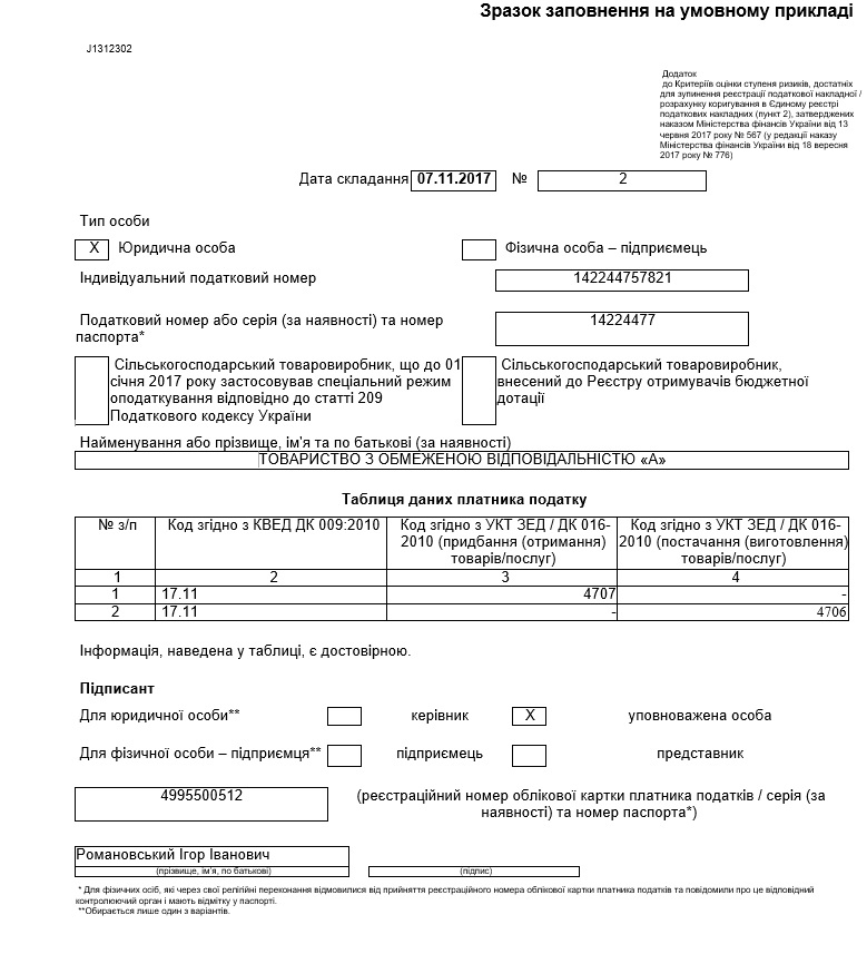 - Таблицю даних платника податку (додаток до наказу Міністерства фінансів України (далі – МФУ) від 13.06.17 №567) за формою J(F)1312302 (далі – Таблиця);