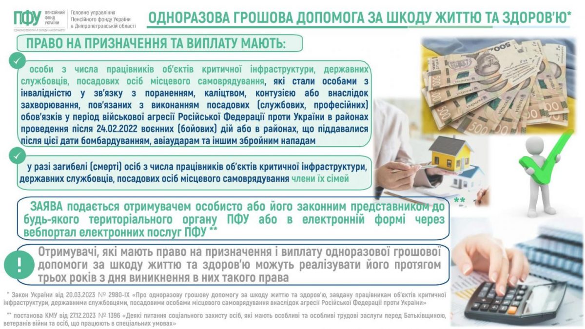 В соответствии с Законом Украины от 20 марта 2023 года № 2980-IX «Про одноразову грошову допомогу за шкоду життю та здоров’ю, завдану працівникам об’єктів критичної інфраструктури, державним службовцям, посадовим особам місцевого самоврядування внаслідок військової агресії Російської Федерації проти України» предусмотрено предоставление одноразовой денежной помощи за ущерб жизни и здоровью в результате военной агрессии рф против Украины.