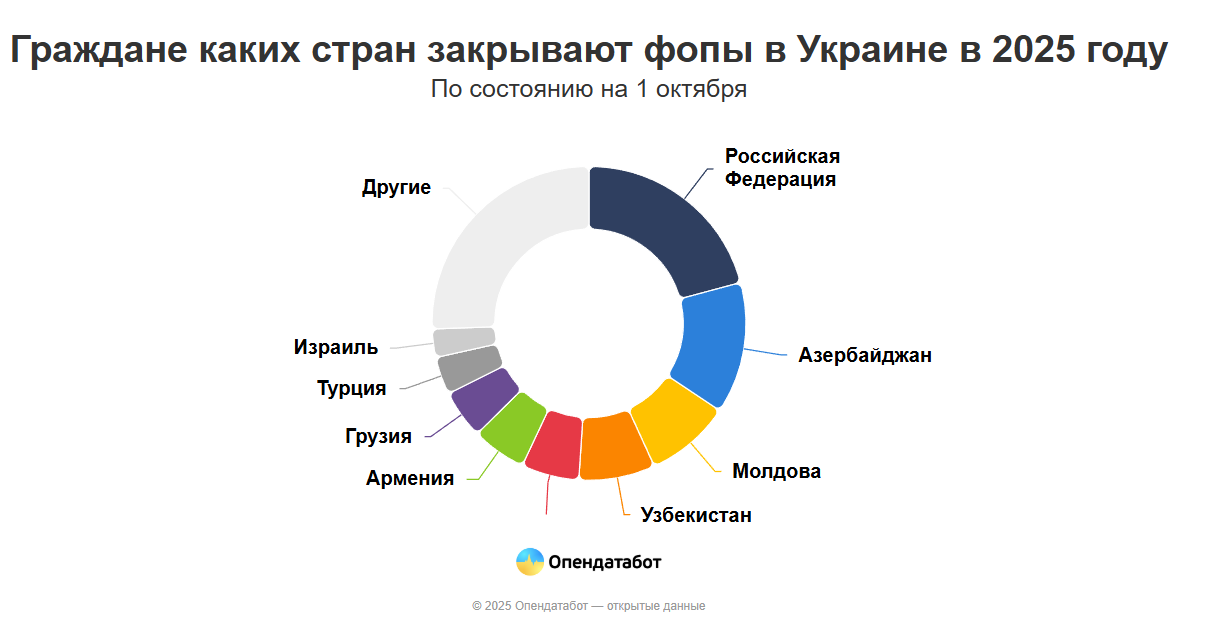 Среди новых предпринимателей больше всего граждан Азербайджана — 229 фопов (14%), далее идут граждане Российской Федерации — 222 (14%), Узбекистана — 160 (10%), Молдовы — 125 (8%) и Армении — 95 (6%).