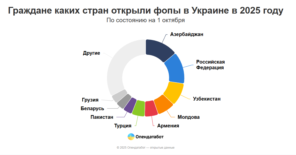 За девять месяцев 2025 года иностранцы открыли в Украине более 1,6 тысячи фопов, по данным Единого государственного реестра. Это почти на 10% меньше, чем за аналогичный период прошлого года. В то же время чистый прирост между открытиями и закрытиями составил 490 фопов-нерезидентов. Чаще всего предпринимателями в Украине становятся граждане Азербайджана, России и Узбекистана.
