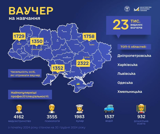 Люди с ваучером могут выбрать одну из 156 специальностей. В программе участвуют более тысячи учебных заведений по всей Украине. Обучение длится до полутора лет, в зависимости от специальности, затем человек получает диплом или сертификат государственного образца. Программой могут воспользоваться также и те, кто работает.