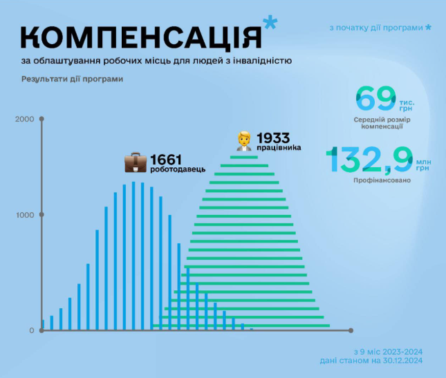 Еще у нас есть компенсационные программы – мы возмещаем работодателю расходы за обустройство рабочего места для человека с инвалидностью – 120 тысяч гривен для 1 группы и 80 тысяч гривен – для 2 группы. Работодатель, который трудоустраивает внутренне перемещенных людей, получает компенсацию расходов на оплату труда по 8 тысяч гривен в течение 3 месяцев. Если человек имеет инвалидность, то выплаты продолжаются 6 месяцев. Такие программы работают и на человека, и на работодателя.