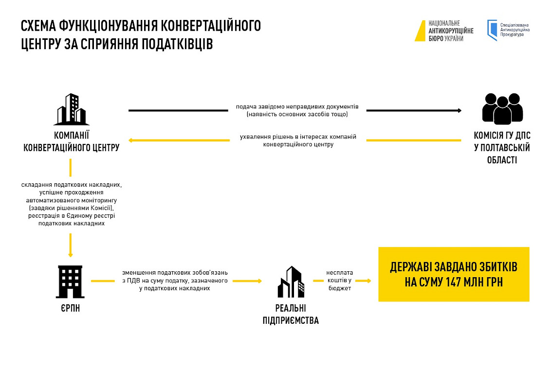 Следствие установило, что тогдашний и.о. главы Государственной налоговой службы Украины способствовал беспрепятственной деятельности конвертационного центра, а заместитель начальника Главного управления ГНС в Полтавской области, которая возглавляла комиссию по вопросам остановки регистрации налоговых накладных, обеспечивала принятие решений в пользу компаний конвертационного центра.