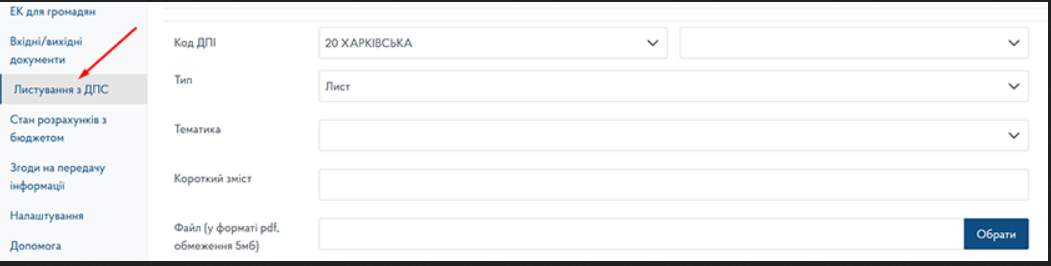 Для цього використовуємо меню “Листування з ДПС” у приватній частині Електронного кабінету. Зверніть увагу: ця вкладка дозволяє вам прикріпити сканований документ у форматі PDF, але його загальний розмір не повинен перевищувати 5 мегабайт.