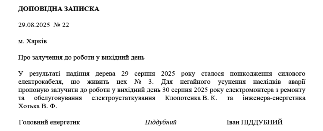 Образец для заполнения можно скачать здесь: Доповідна записка про залучення до роботи у вихідний день