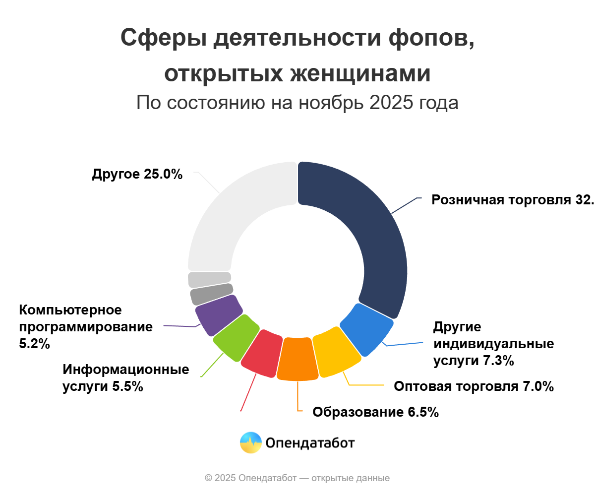 Каждый третий новый женский бизнес открывается в сфере розничной торговли — 49,7 тыс. Востребованы также индивидуальные услуги (11,1 тыс.), оптовая торговля (10,7 тыс.), образование (10 тыс.) и бизнесы в сфере питания (8,8 тыс.).