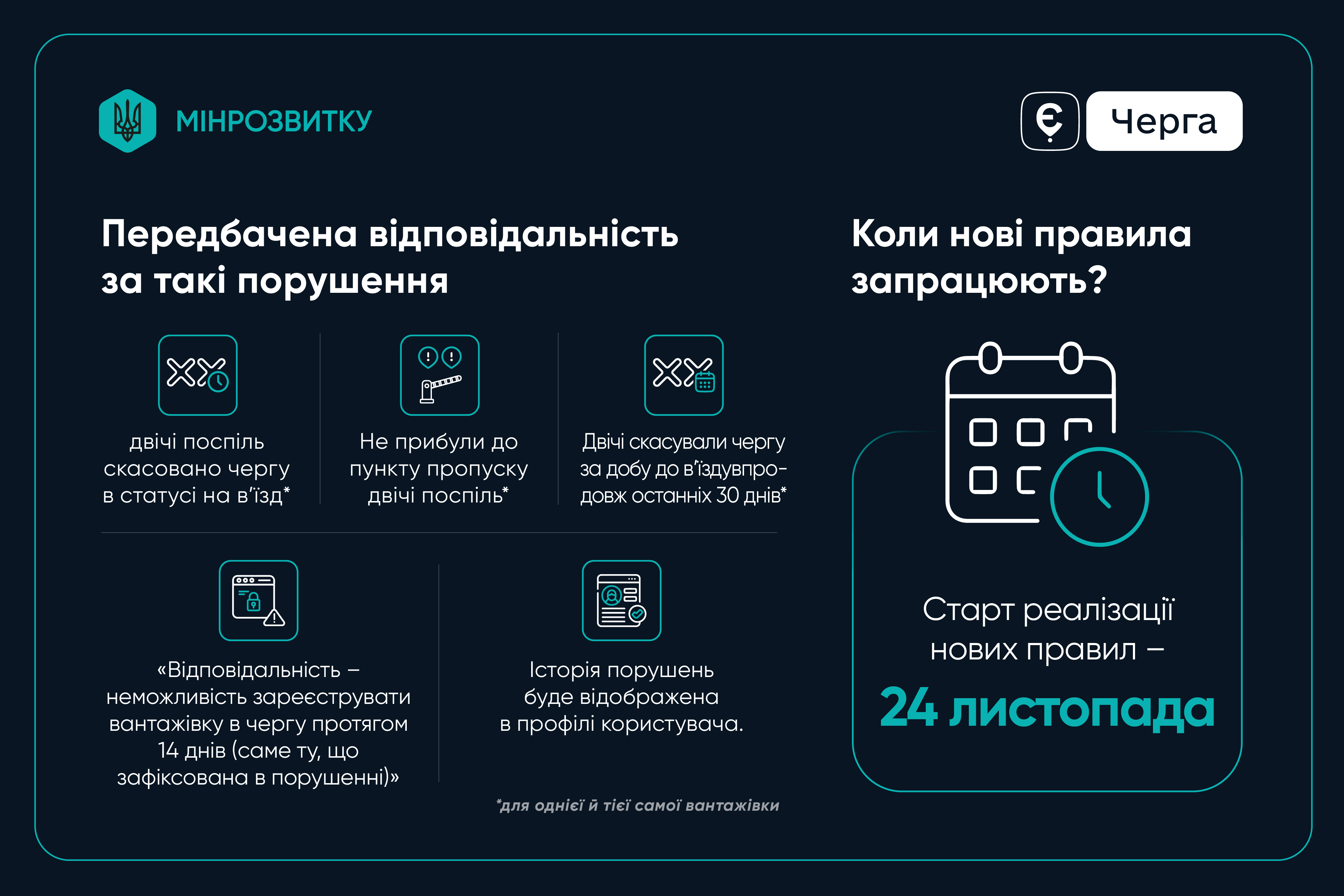 Обновленные правила создают четкие механизмы дисциплины и ответственности. Эти инструменты позволят обеспечить стабильность очереди и равные условия для всех перевозчиков, как украинских, так и иностранных.