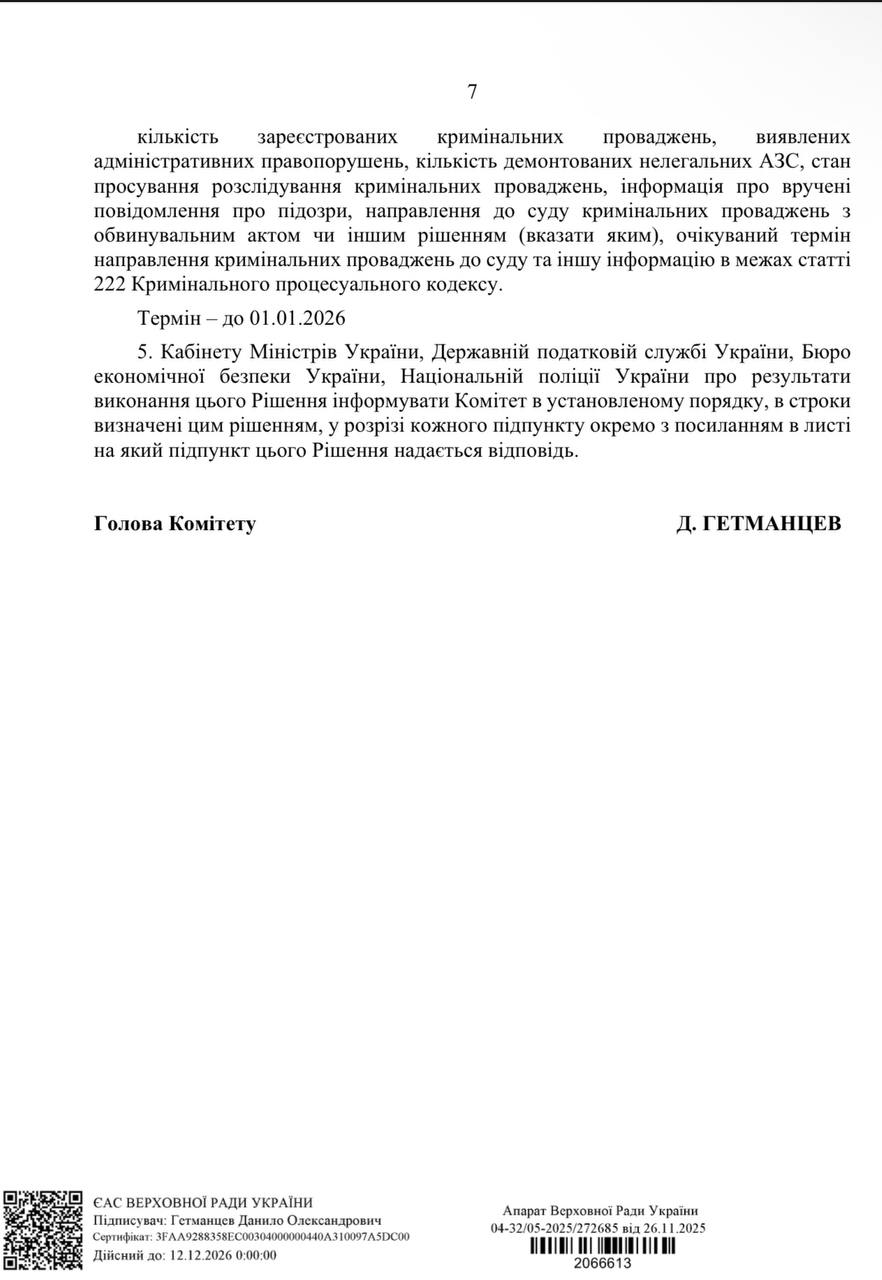 КМУ должен до 1 февраля 2026 г. сформировать полный перечень нелегальных АЗС и обеспечить конкретные результаты по каждой из них — от легализации до демонтажа и привлечения виновных к ответственности.