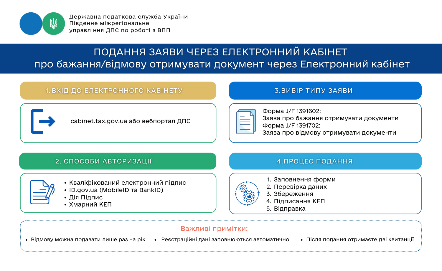 Режим «Введення звітності» частной части Электронного кабинета обеспечивает возможность создания налогоплательщиками налоговой, финансовой, статистической отчетности, отчетности по единому взносу на общеобязательное государственное социальное страхование, в частности «Заяви про бажання отримувати документ через Електронний кабінет» (J/F 1391602) и «Заяви про відмову отримувати документ через Електронний кабінет» (J/F 1391702), и подачи ее в контролирующие органы.