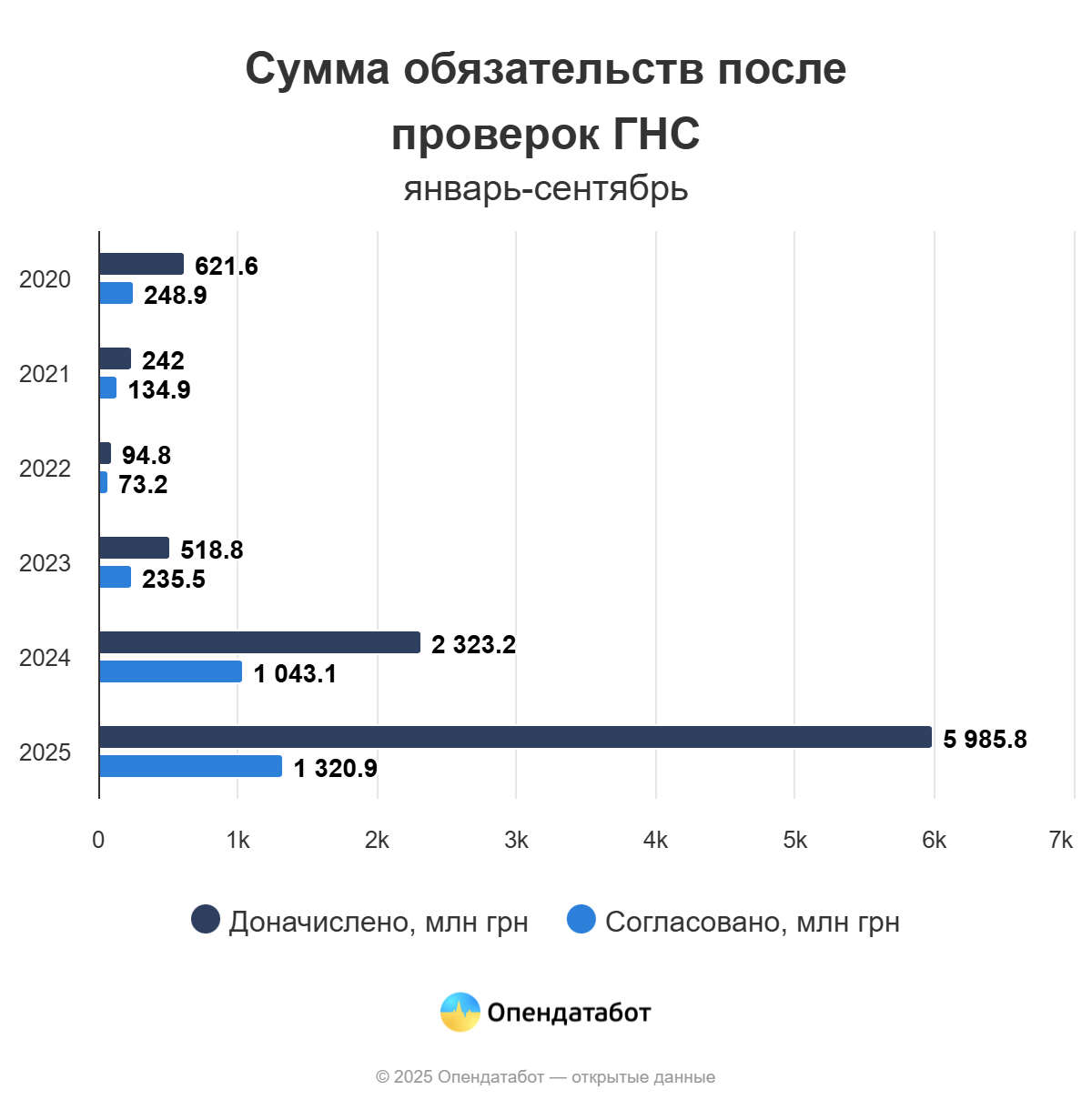 Несмотря на относительно сдержанные темпы роста числа проверок, суммы, которые бизнес должен «доплатить», в этом году существенно выросли — но есть нюанс. В целом Налоговая доначислила предпринимателям 5,98 млрд грн за три квартала 2025 года. Это в 2,6 раза больше, чем в прошлом году, и в 25 раз больше, чем в 2021 году. Хотя суммы к уплате растут, это ещё не означает, что предприниматели действительно обязаны их заплатить — на данный момент согласовано лишь около 22%, то есть 1,32 млрд грн. Для сравнения: в прошлом году за этот период согласовали почти половину доначислений.