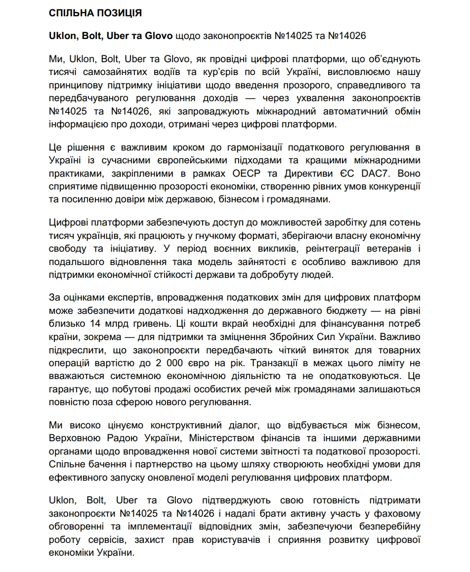 Сервисы Uklon, Bolt, Uber и Glovo поддержали правительственные законопроекты № 14025 и № 14026, которыми предусмотрено внедрение обмена информацией о доходах, полученных через цифровые платформы. Об этом говорится в совместной позиции упомянутых выше компаний, которая есть в распоряжении ЭП.