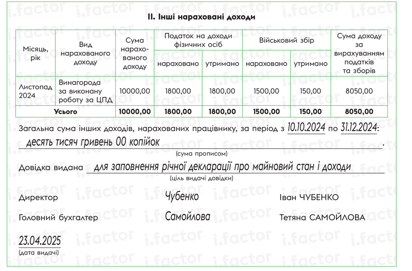 Разом із бланком ви можете скористатися зразком заповнення довідки про доходи, який допоможе правильно внести дані: