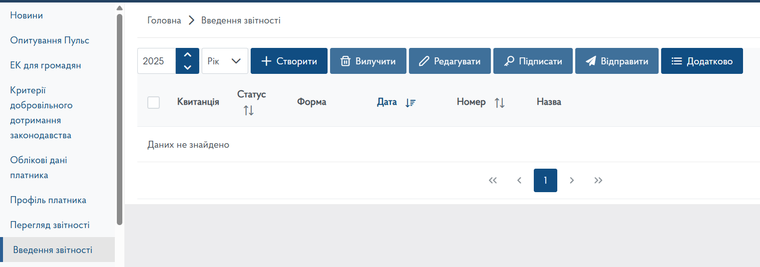 В разделе Введение отчетности Электронного кабинета налогоплательщика от ГНС выберите 2025 год. Нажимаем Создать.
