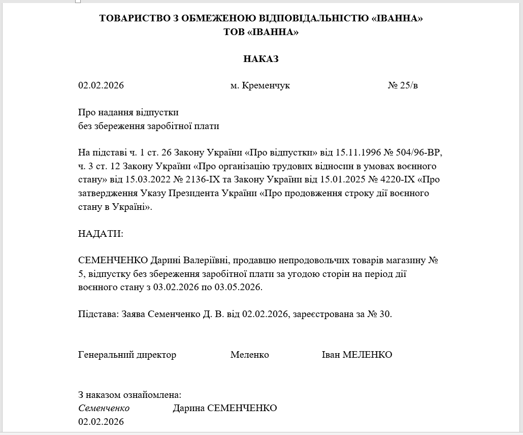 Відпустка за власний рахунок на період воєнного стану (з продовженням): заява та наказ