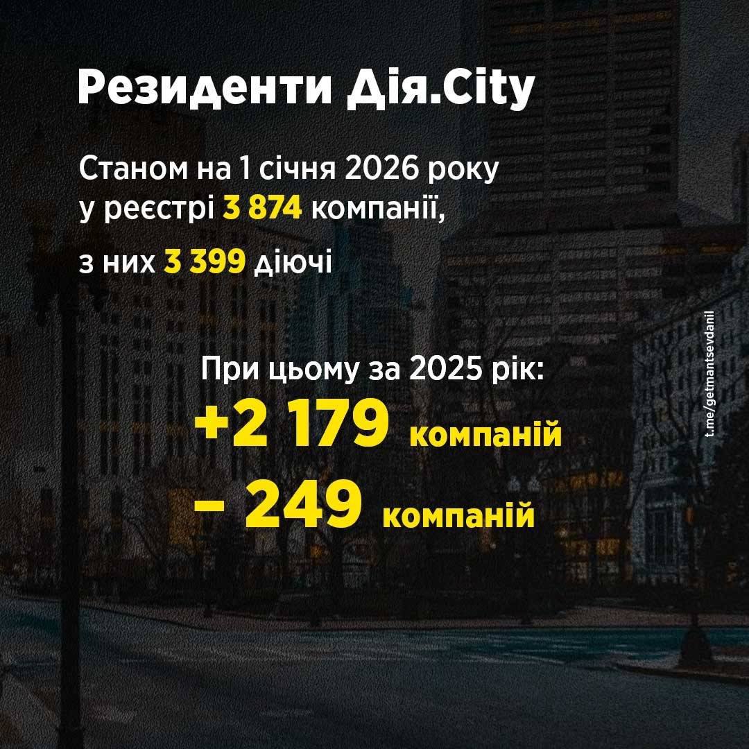 Дія.City продолжает масштабироваться, становясь ключевым драйвером украинской технологической отрасли. По состоянию на 1 января 2026 года у нас зарегистрировано 3 874 резидента, из которых 3 399 являются активно действующими компаниями.