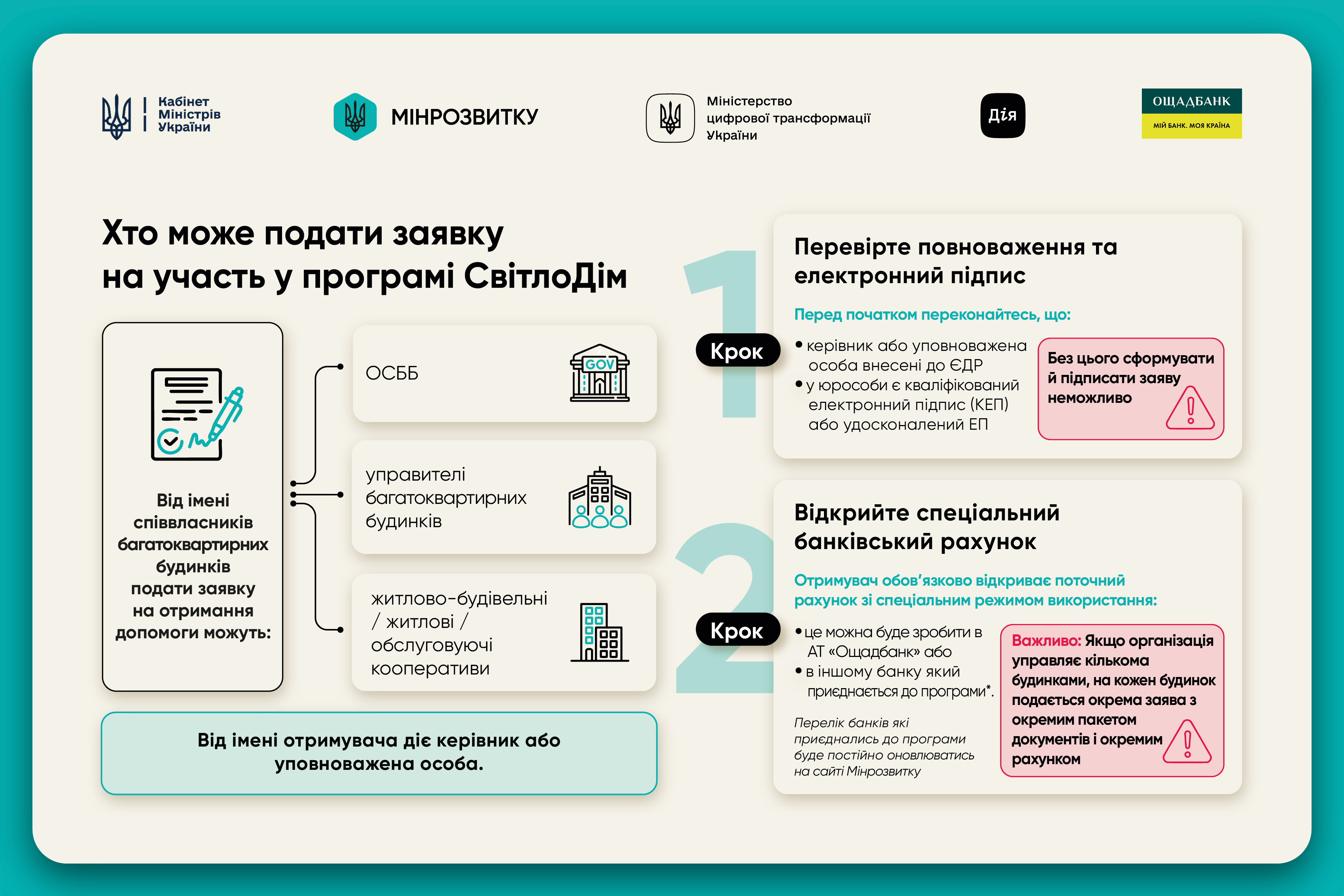 ОСББ, жилищные и обслуживающие кооперативы, управляющие многоквартирных домов любой формы собственности теперь могут подать заявку на сайте https://svitlodim.gov.ua/, через электронный кабинет на портале Дія.