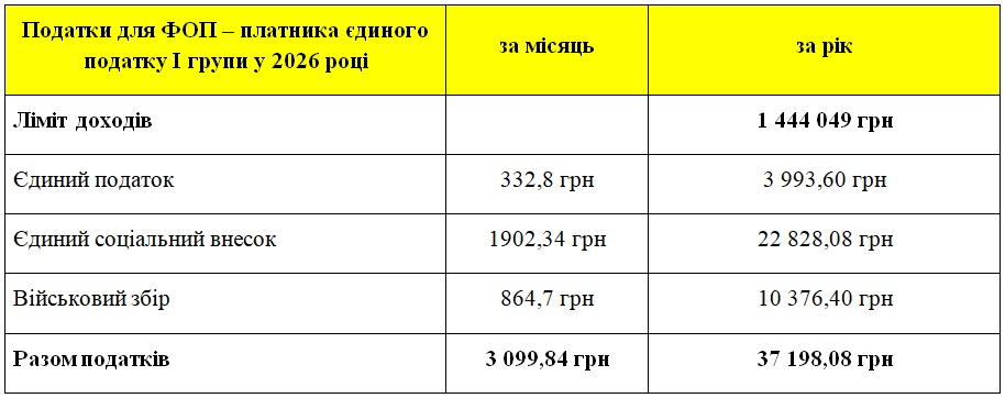 Тобто загальне річне податкове навантаження за таких умов у ФОПів І групи у 2026 році становитиме 37 198,08 грн при ліміті доходів 1 444 049 грн.