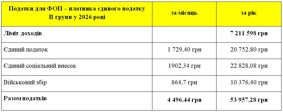 Тобто загальне річне податкове навантаження за таких умов у ФОПів ІІ групи у 2026 році становитиме 53 957,28 грн при ліміті доходів 7 211 598 грн.