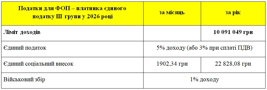 У 2026 році для ІІІ групи застосовуватимуться ставки єдиного податку у відсотках до доходу: 5% або 3% при сплаті ПДВ.