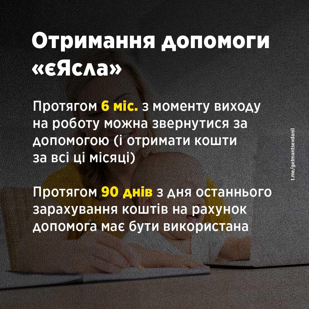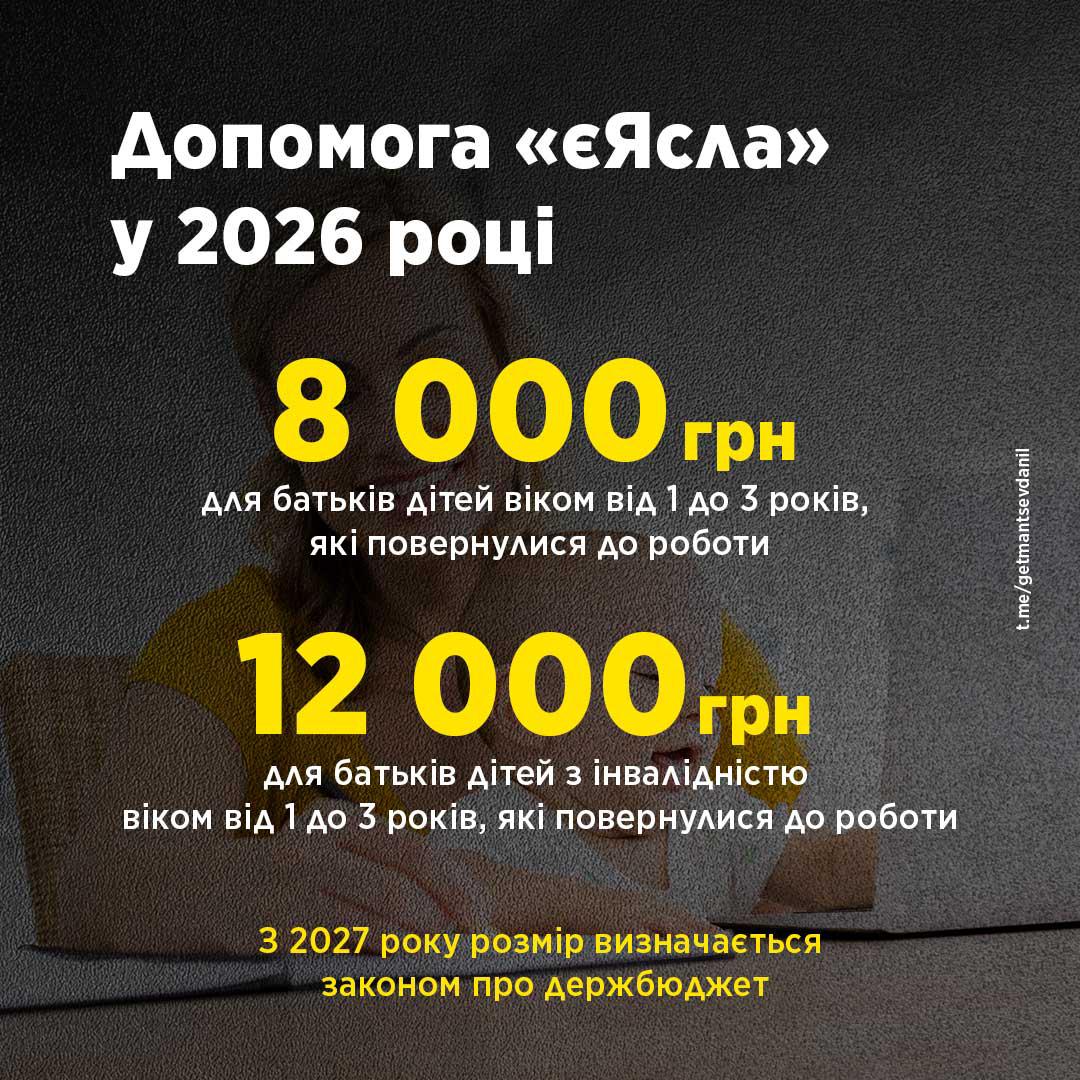 🔹 Помощь «єЯсла» — это ежемесячная государственная выплата для родителей детей в возрасте от 1 до 3 лет, которые вернулись к работе. В 2026 году ее размер составляет 8 000 грн, а для ребенка с инвалидностью — 12 000 грн.
