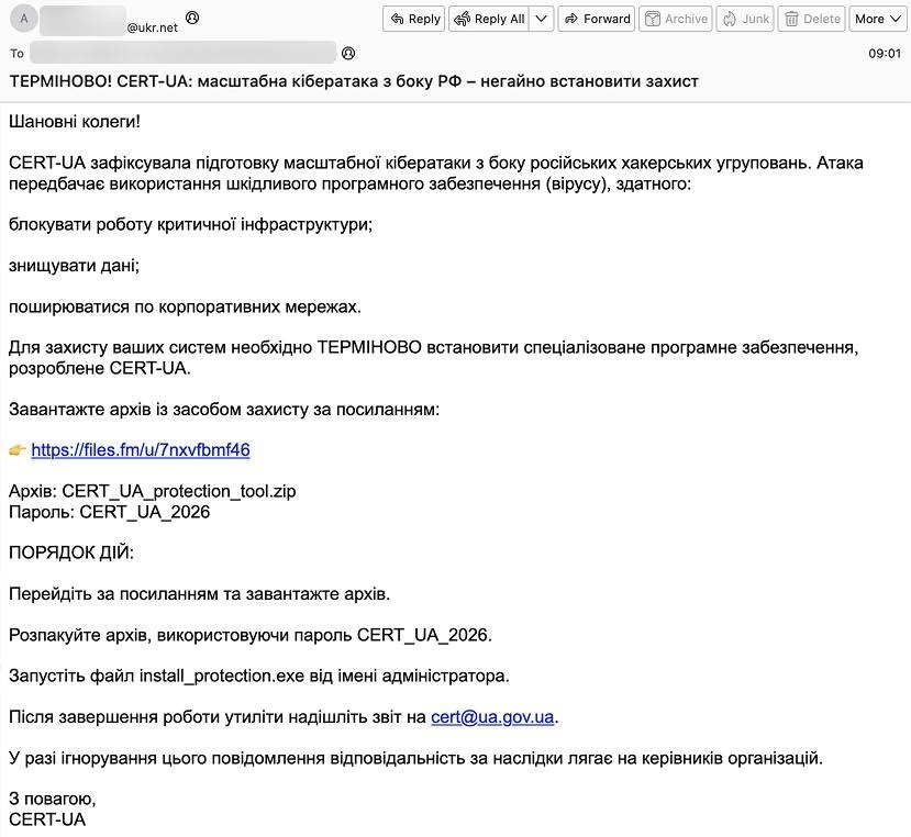 Наголошуємо, що CERT-UA не розповсюджує програмні засоби електронною поштою. Також звертайте увагу на адресу відправника. Офіційні поштові скриньки команди мають домен @cert.gov.ua.