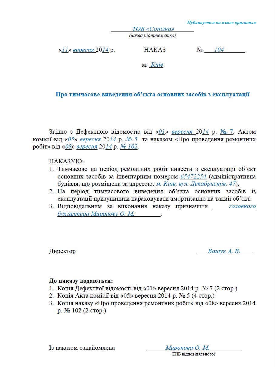 Например, если во время ремонта все сотрудники переезжают работать в другой офис, а все работы, которые при этом проводились в здании (расфасовка товаров, работа оборудования или устройства и т.д.) приостанавливаются, в данном случае нужно составлять приказ о выводе объекта из эксплуатации. Ведь фактически на период ремонтных работ здание не будет использоваться не только по своему прямому назначению, но и вообще в хозяйственной деятельности.