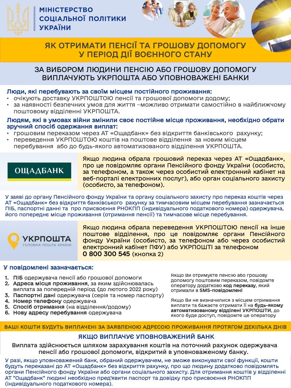 Міністерство соціальної політики України оприлюднило інфографіку про отримання пенсії та грошової допомоги у період дії воєнного стану.