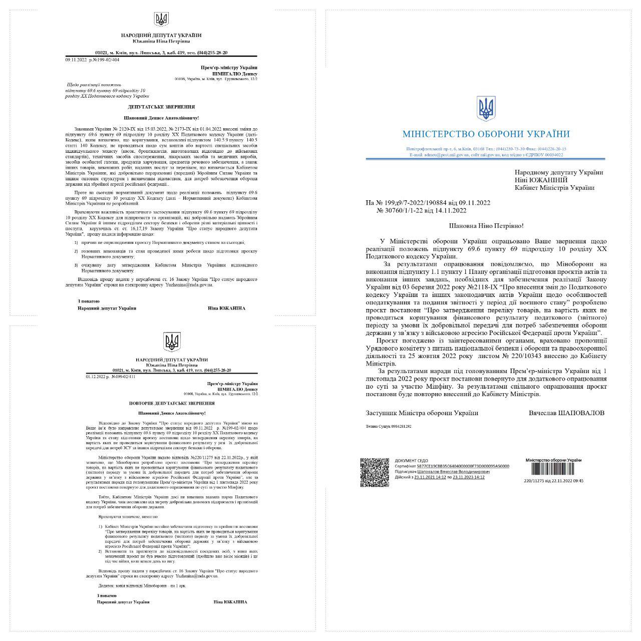 Н. Южаніна отримала відповідь від Міноборони: проєкт було погоджено із заінтересованими органами, ще 25.10.2022 року внесено до Кабінету Міністрів, але повернуто для додаткового опрацювання по суті за участю Мінфіну.