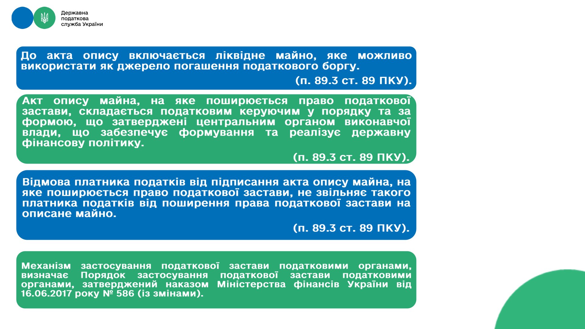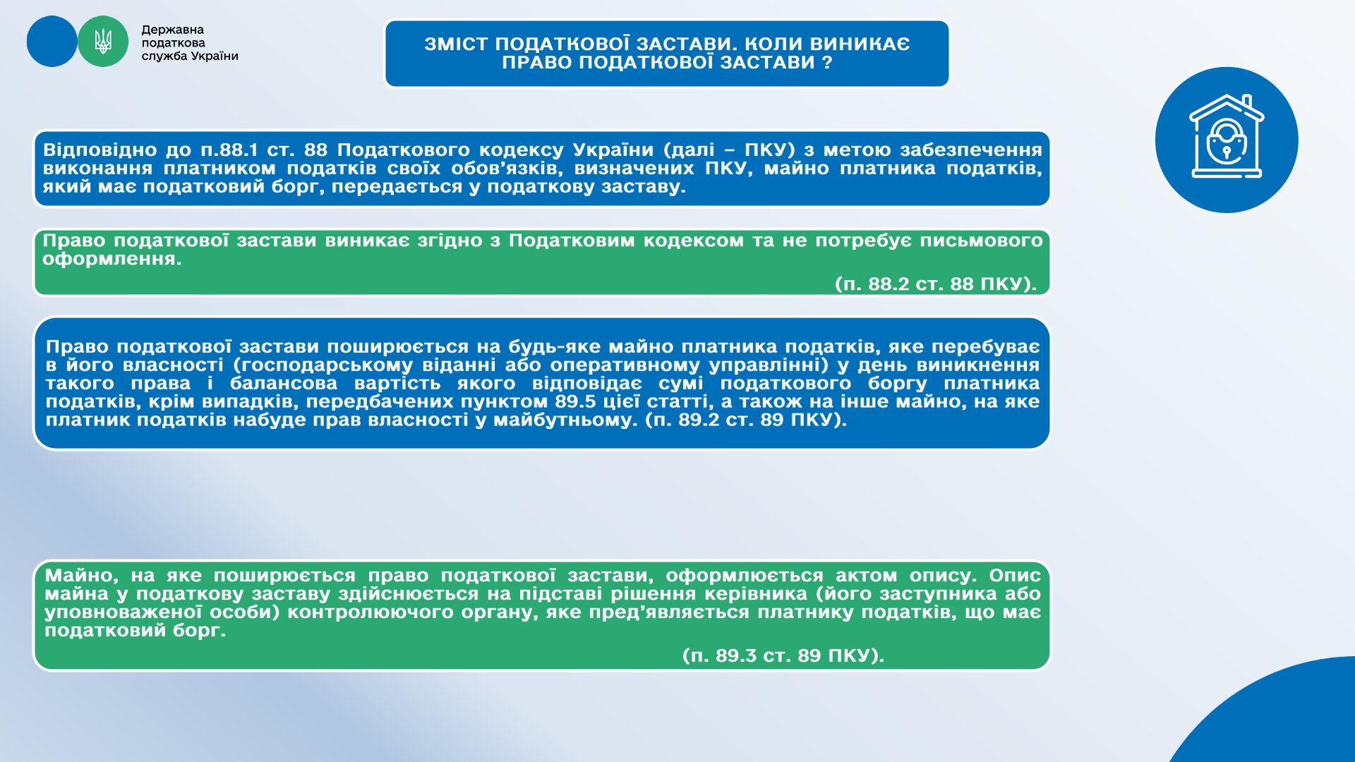 Державна податкова служба України розробила презентаційні матеріали на тему змісту податкової застави та розповіла коли виникає право податкової застави.