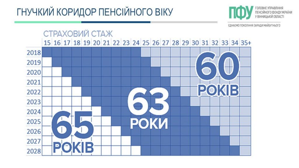 Тривалість страхового стажу, що дає право на вихід на пенсію в 60 років, з кожним роком зростатиме. Цей процес триватиме до 2028 року. Так, щоб вийти на пенсію в 60 років в 2028 році потрібно буде мати не менше, ніж 35 років стажу.