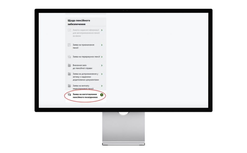 2. В особистому кабінеті на панелі ліворуч у розділі “Щодо пенсійного забезпечення” оберіть вкладку Заява на виготовлення пенсійного посвідчення”.