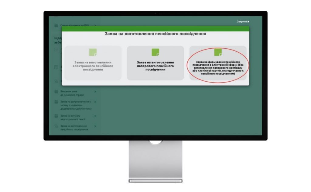 3. У наступному полі оберіть опцію “Заява на виготовлення пенсійного посвідчення в електронній формі (без виготовлення паперового оригіналу або платіжної картки, яка одночасно є пенсійним посвідченням)”.