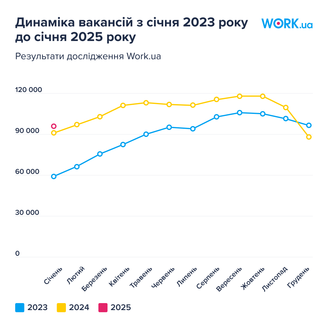 У перший місяць 2025 року на сайті Work.ua роботодавці розмістили 94 985 вакансій. Це на 7% пропозицій роботи більше, ніж було в грудні. Ця цифра практично не відрізняється від кількості роботи в січні 2022 року — останньому місяці до повномасштабного вторгнення. Тоді на ринку праці було 97 349 вакансій.