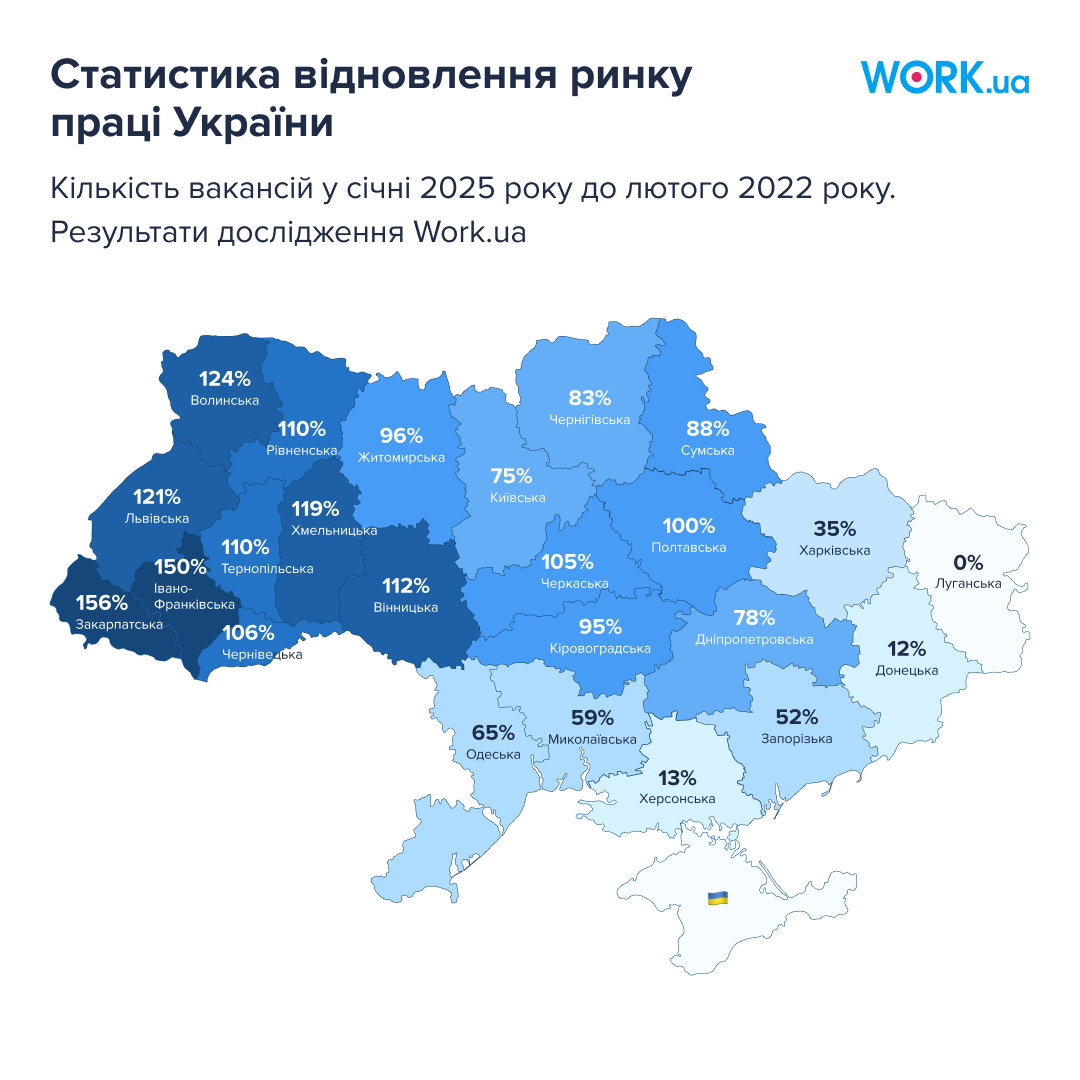 І хоча за кількістю роботи бачимо практично повне відновлення, структурно розподіл вакансій змінився. У прифронтових регіонах вакансій усе ще набагато менше, ніж було до повномасштабного вторгнення.