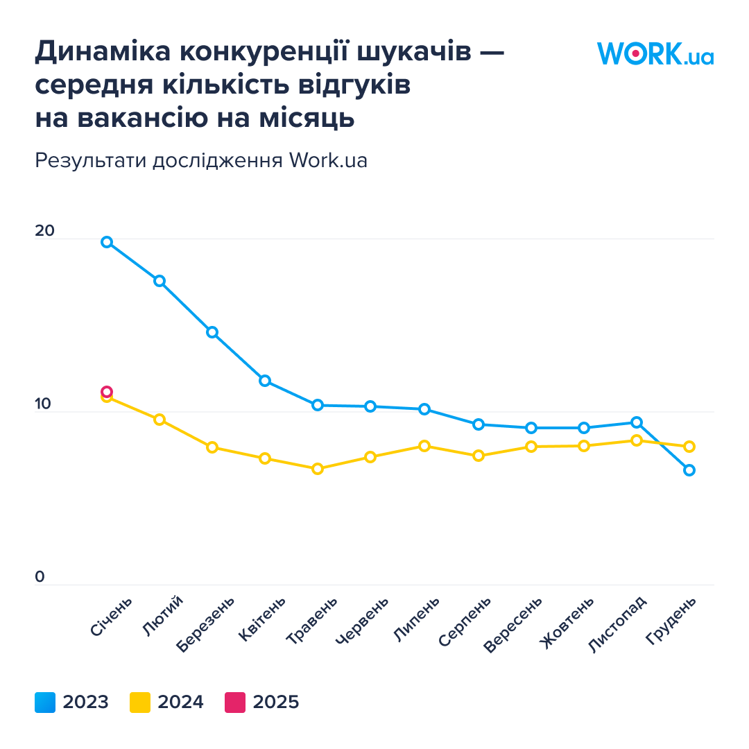 Натомість найнижчу конкуренцію бачимо за вакансії в категоріях «Охорона, безпека», «Робочі спеціальності, виробництво», «Будівництво, архітектура», «Транспорт, автобізнес», «Медицина, фармацевтика».