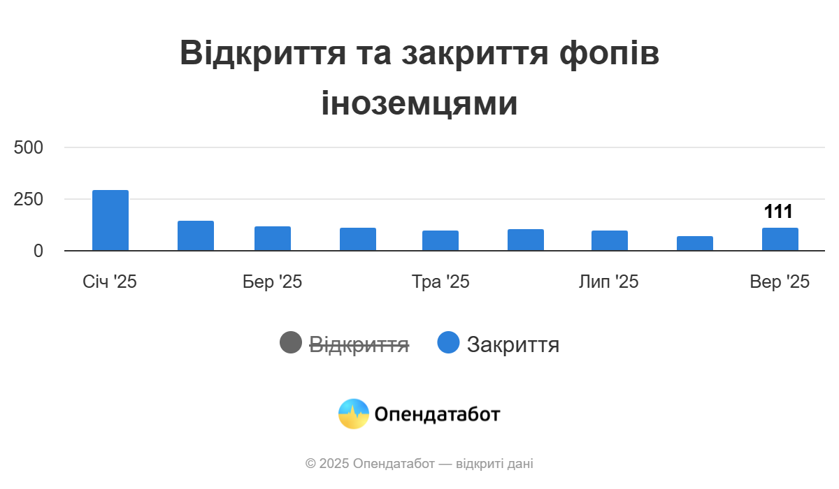 Водночас 1158 фопів-іноземців за цей самий час припинили свою діяльність. Чистий приріст склав 490 підприємців-нерезидентів. Загалом понад 213 тисяч підприємців закрилися в Україні за цей період, тож частка іноземців складає лише 0,5%.