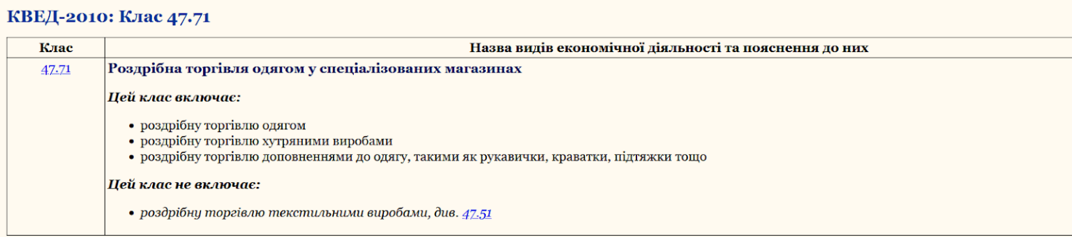 Наприклад, якщо ви продаєте одяг у стаціонарному магазині (код 47.71), а потім вирішите продавати цей же одяг онлайн, вам знадобиться ще один код — 47.91 «Роздрібна торгівля через інтернет або поштове замовлення».