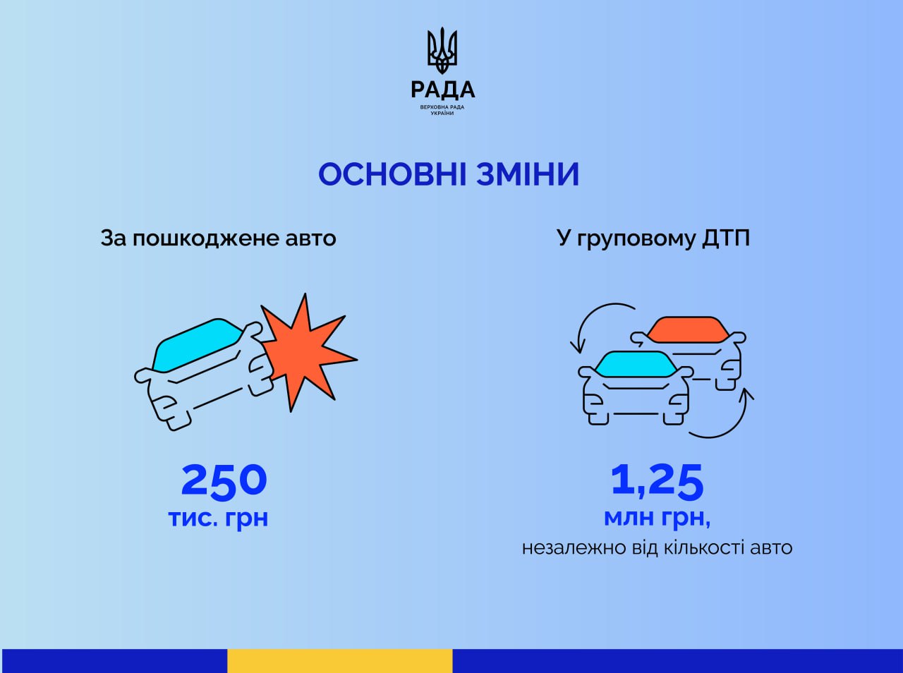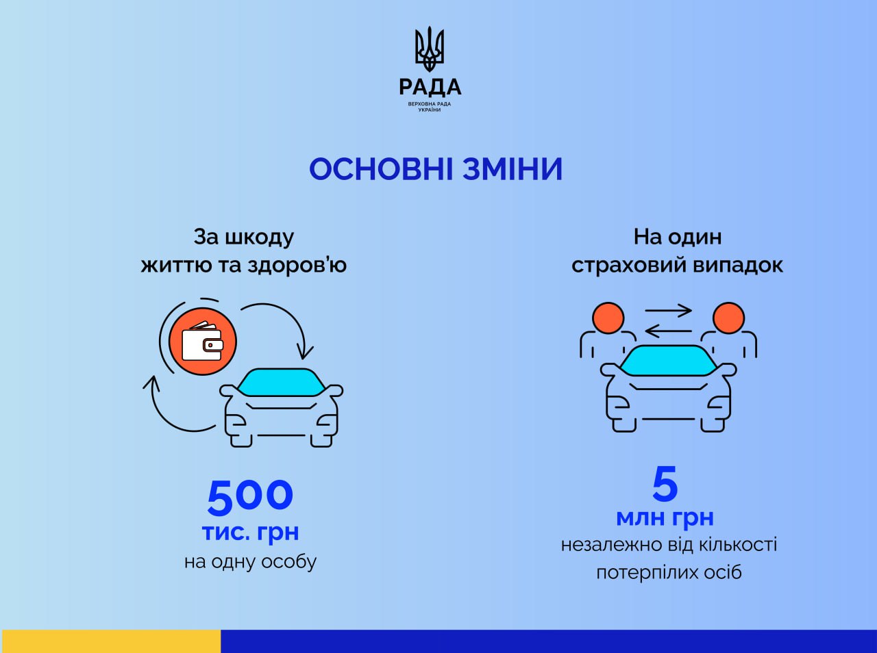 ► Збільшення страхових сум у випадку ДТП. Наразі розмір страхової суми за шкоду, заподіяну життю та здоров’ю потерпілих осіб, становить 500 тис. грн на одну потерпілу особу та 5 млн грн на один страховий випадок — незалежно від кількості потерпілих осіб.
