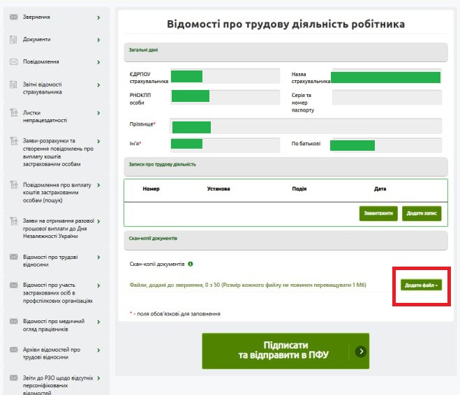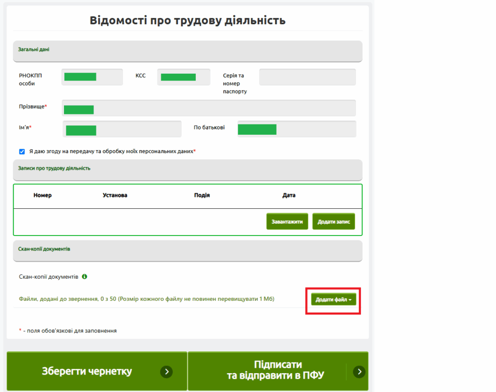 Наступний крок – перевірити свої дані, які підтягнуться автоматично, та поставити галочку про згоду на обробку персональних даних. Далі – завантажте кольорові скан-копії сторінок трудової книжки. Підписати і натиснути «Відправити».