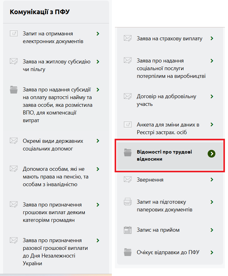 Далі у розділ «Комунікації з ПФУ» слід вибрати «Відомості про трудові відносини».