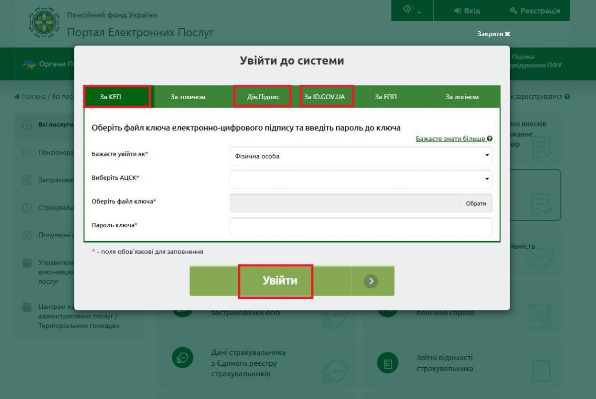 1. Авторизуйтеся на вебпорталі Пенсійного фонду України https://portal.pfu.gov.ua, будь-яким зручним способом (КЕП, Дія.Підпис чи ID.GOV.UA).