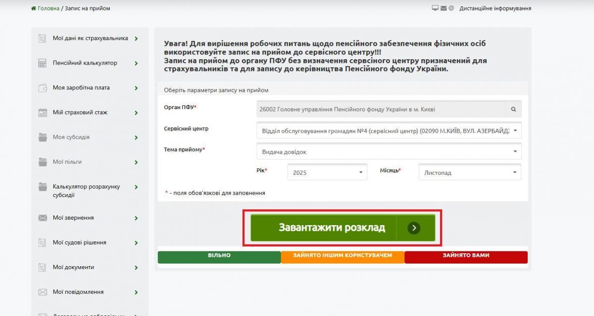 5. Після заповнення форми натисніть кнопку “Завантажити розклад”.