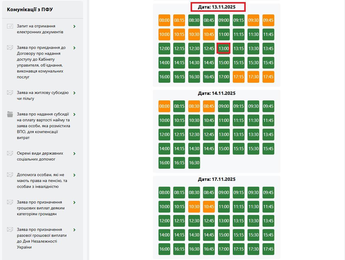 6. Із запропонованих варіантів оберіть зручні день і час для відвідування сервісного центру Пенсійного фонду України. Запис здійснюється, починаючи з наступного робочого дня (за наявності вільних місць), не більше ніж протягом місяця.