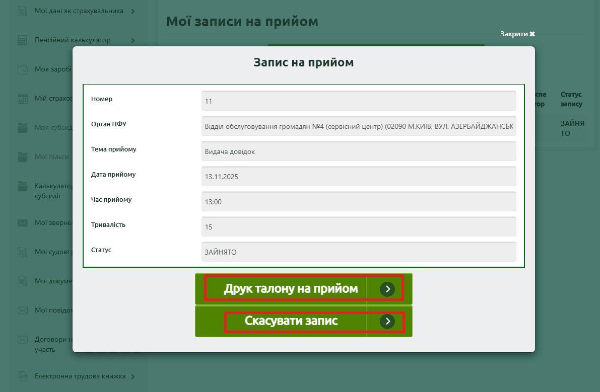 8. Натиснувши на рядок із обраним відділом обслуговування громадян (сервісним центром), можна обрати опцію “Друк талону на прийом” або “Скасувати запис”.