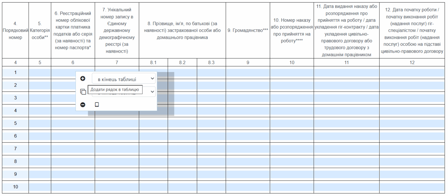 Повідомлення про прийняття на роботу подається на кожного працівника окремим рядком у табличній частині однієї форми. Тобто, якщо ви приймаєте на роботу кількох працівників, ви заповнюєте одне Повідомлення на всіх, вказуючи інформацію про кожного працівника в окремому рядку цього документа.