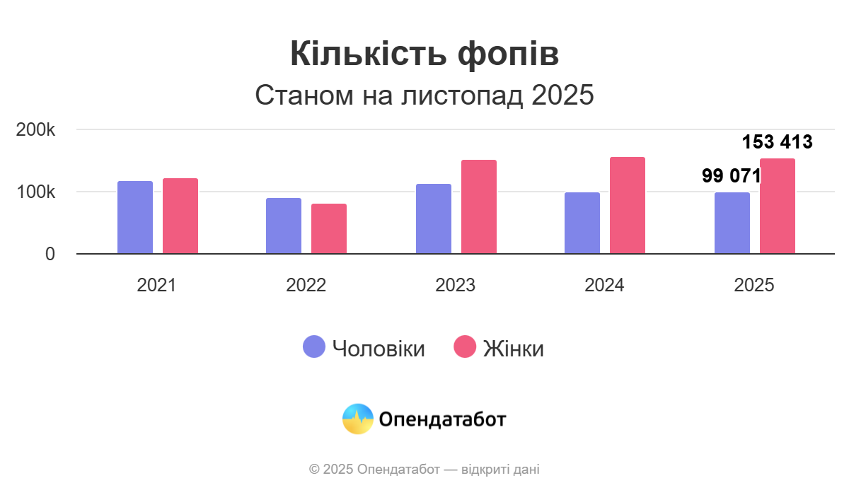 153 413 нових фопів зареєстрували жінки — це 61% від усіх нових реєстрацій. До порівняння, ще у 2021 році частка жінок складала 51%.
