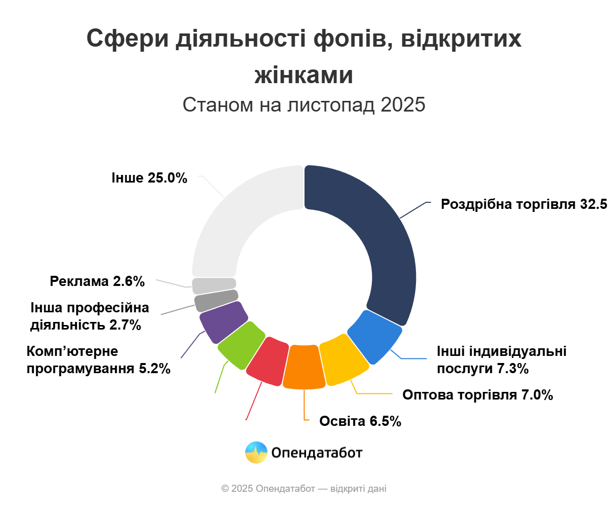 Понад 153 тисячі нових фопів відкрили жінки за 10 місяців 2025 року в Україні з даними Єдиного державного реєстру. Це 61% від загальної кількості новостворених фопів у 2025 році. Найбільше бізнесів зареєстрували цьогоріч жінки у столиці, на Дніпропетровщині та Київщині. Серед сфер жіночого підприємництва лідирують торгівля, освіта та краса.