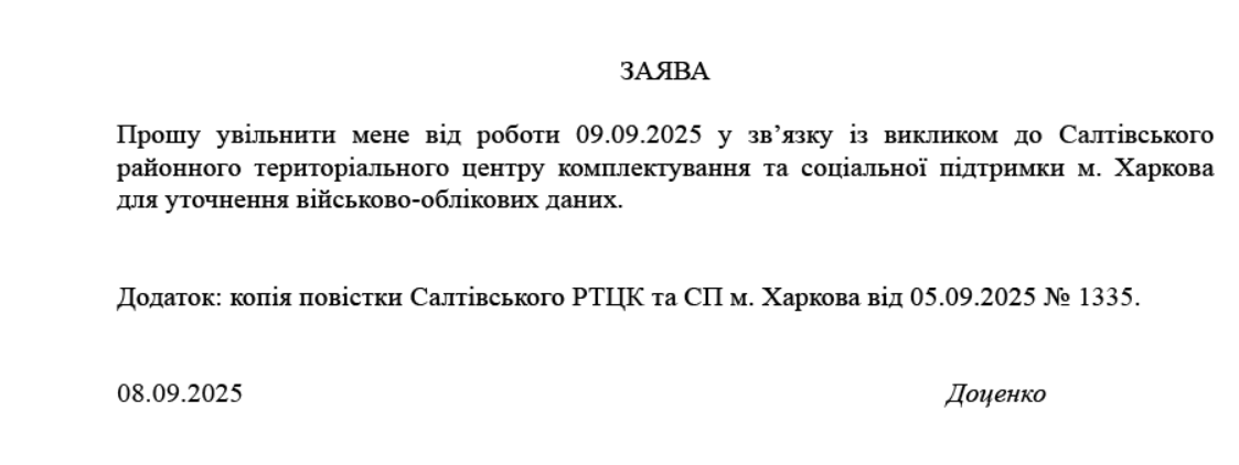 Робота зачекає… або Заява про увільнення від роботи у зв’язку з викликом до ТЦК