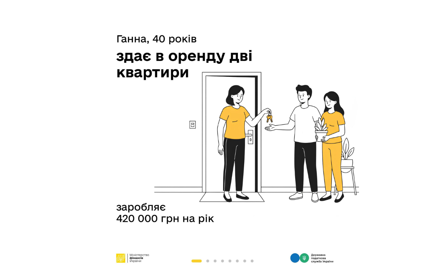 40-річна Ганна має кілька однокімнатних квартир, дві з яких здає в оренду. За квартиру в столиці щомісяця вона отримує 20 тис. грн, а за квартиру в Ужгороді – 15 тис. грн (загалом 105 тис. грн/квартал; 420 тис. грн/рік). Для легалізації доходу, Ганна зареєструвала свою діяльність як ФОП (фізична особа-підприємець) 3 групи. Це дозволяє їй офіційно надавати послуги з оренди громадянам України та іноземцям.
