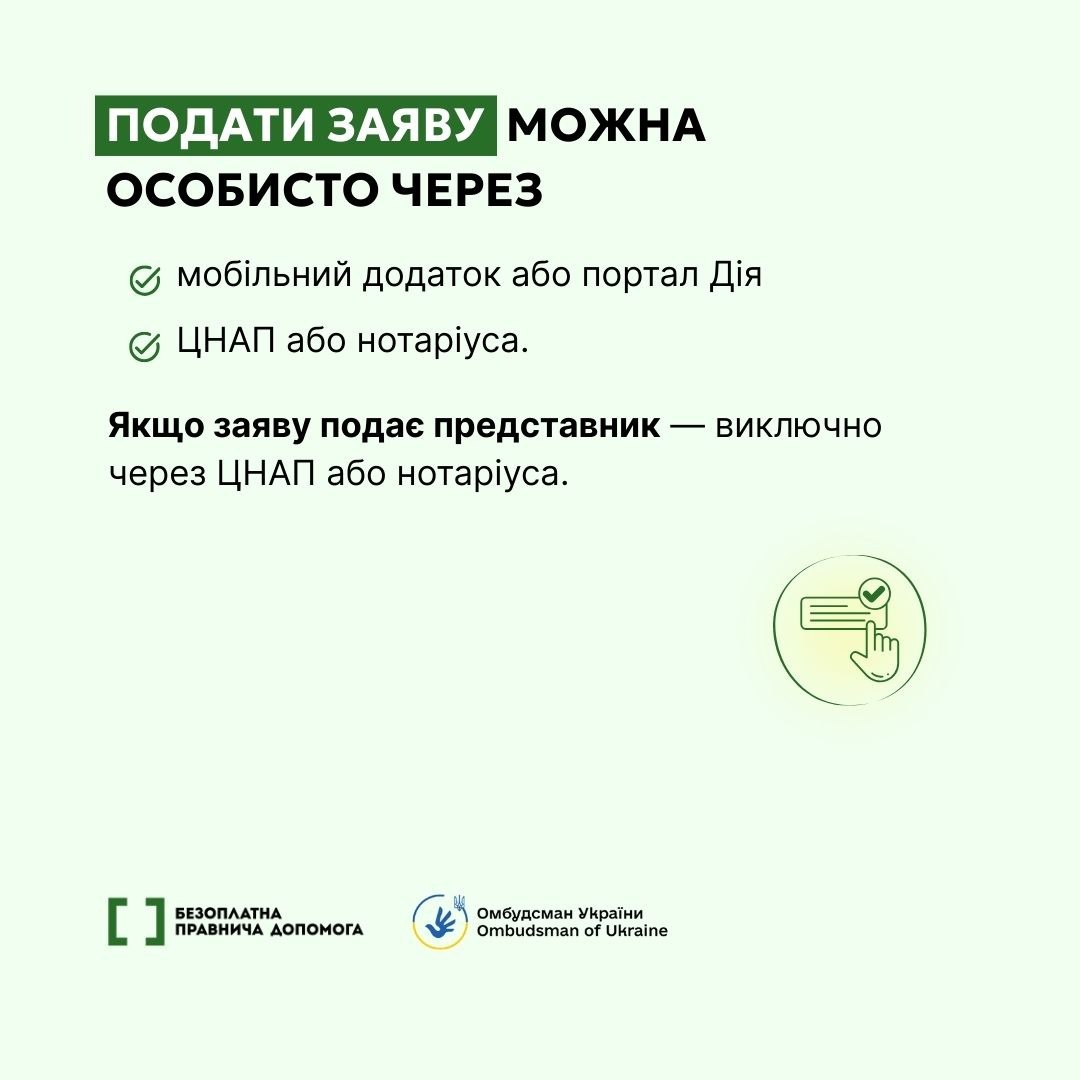 – подати заяву можна особисто або через представника.
